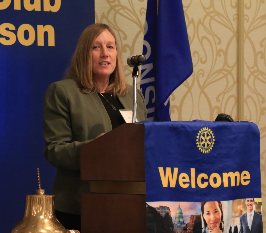 Kelly Lecker, Executive Editor of the Wisconsin State Journal and, 38 years ago the Badger State Spelling Bee champion, was the perfect speaker on March 8th.  In addition to Rotarians, she addressed 11 current Madison winners of the All City Spelling Bee, sponsored by the Wisconsin State Journal since 1949.