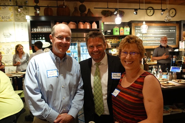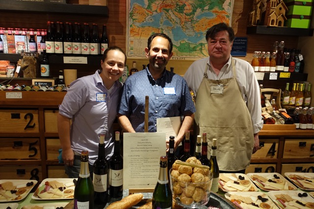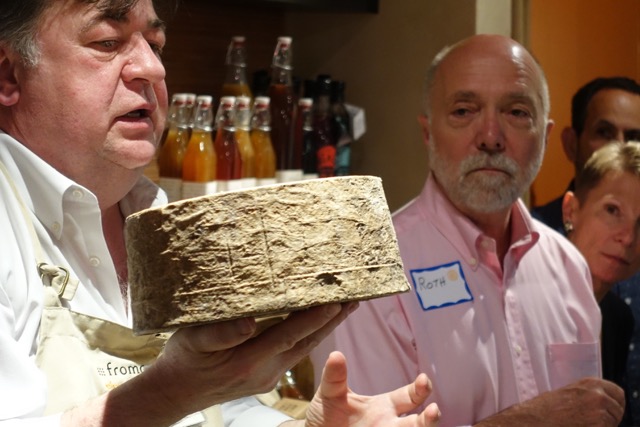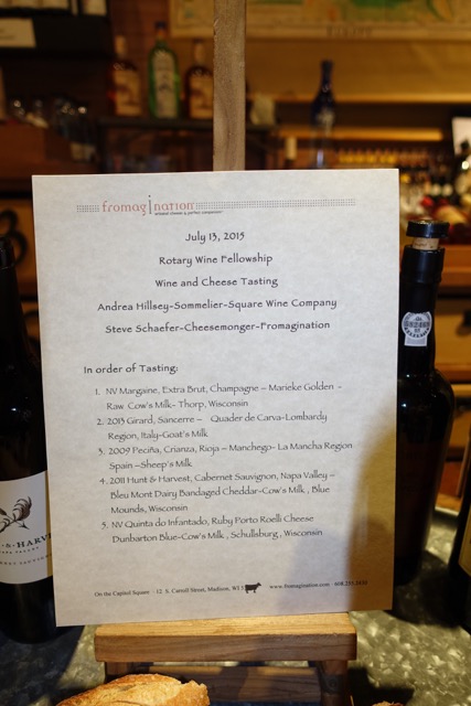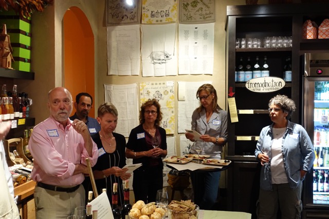 The Wine Fellowship Group met at 7:00 PM Monday July 13 at Fromagination for a wine and cheese tasting. This is the third Fromagination event the Wine Fellowship has held over the years. Rotarians, with spouses and friends attended, and the 23 attendees all had a terrific experience. Ken Monteleone of Fromagination provided his employee Steve Schaefer as the “cheesemonger” and another helper for pouring the wine, and arranged for Andrea Hillsey, sommelier owner of Square Wine Company to supply and collaborate with the wines.