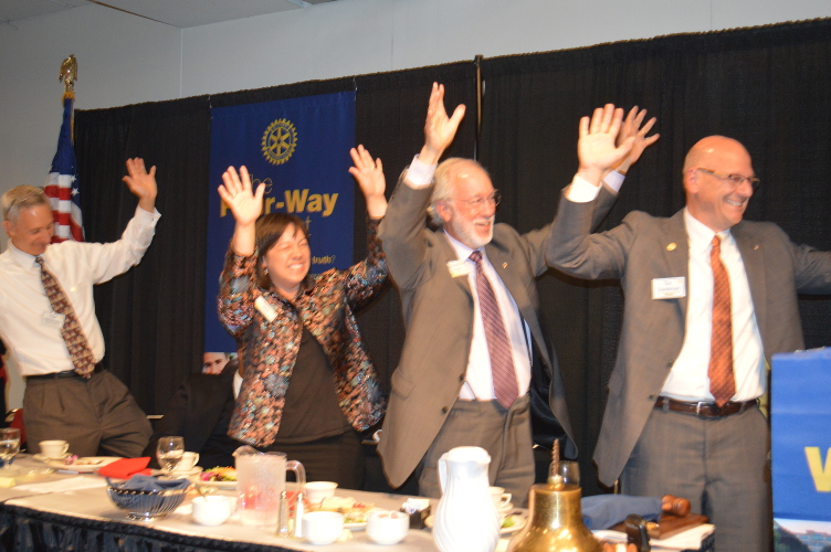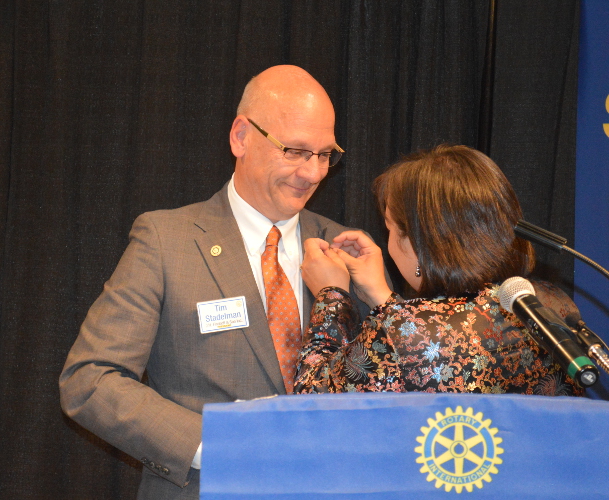 President Ellsworth then ceremonially passed the President’s pin to incoming President Michelle McGrath, and she passed the Vice President’s pin to Donna Hurd. Past President Tim Stadelman welcomed Ellsworth to the Past President’s Club; Renee Moe presented him the Past President’s plaque and Wes Sparkman presented him a Paul Harris Fellow pin.