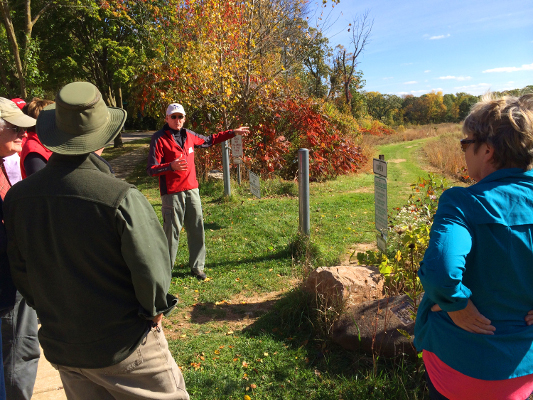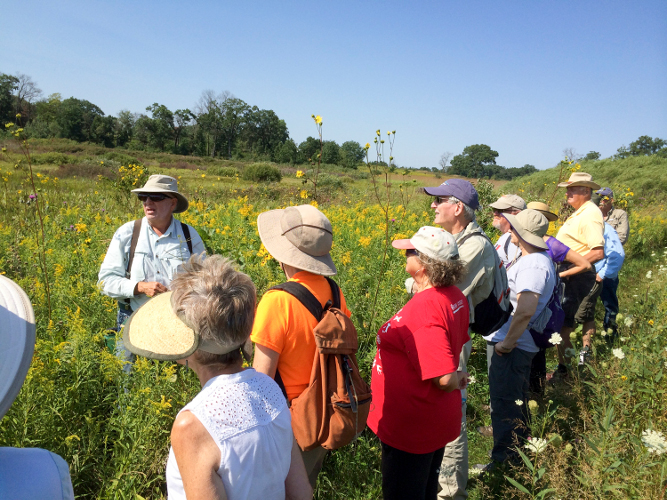 We were pleased to see the Oak planted by Paul Harris and saw turkeys and a red-tail hawk nearby. The hike included a walk through Gallistel and a brief stop at Teal Pond. Curtis Prairie provided the zen-like experience of hearing the courting sounds of the male woodcock who becomes active at dusk. Although the bird was never seen, its presence was clear by the loud, nasal peent calls made on the ground, the twittering sounds made by the wings as the woodcock rises up 100’ or more in an aerial display, the call made at the ‘top’ of the flight, and steep dive back down to the prairie. The Audubon website refers to this behavior as a ‘sky dance’. Female woodcocks are attracted by the ‘lek’ of males performing their rituals and have an opportunity to select the fittest mate.