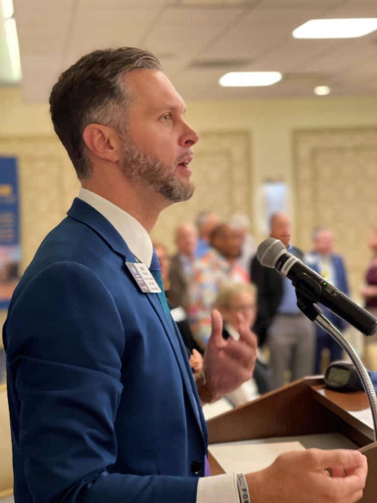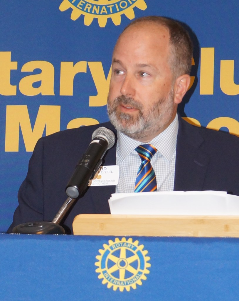 Dean McHugh, District Rotary Governor, addressed the October 12 meeting of the downtown Rotary as one of his 63 talks of the year. Dean is from Holmen, a club of 38 members and ten years old, where he runs an excavation business with his father. Dean shared three stories, powerful to him, that illustrated why Rotary is important.